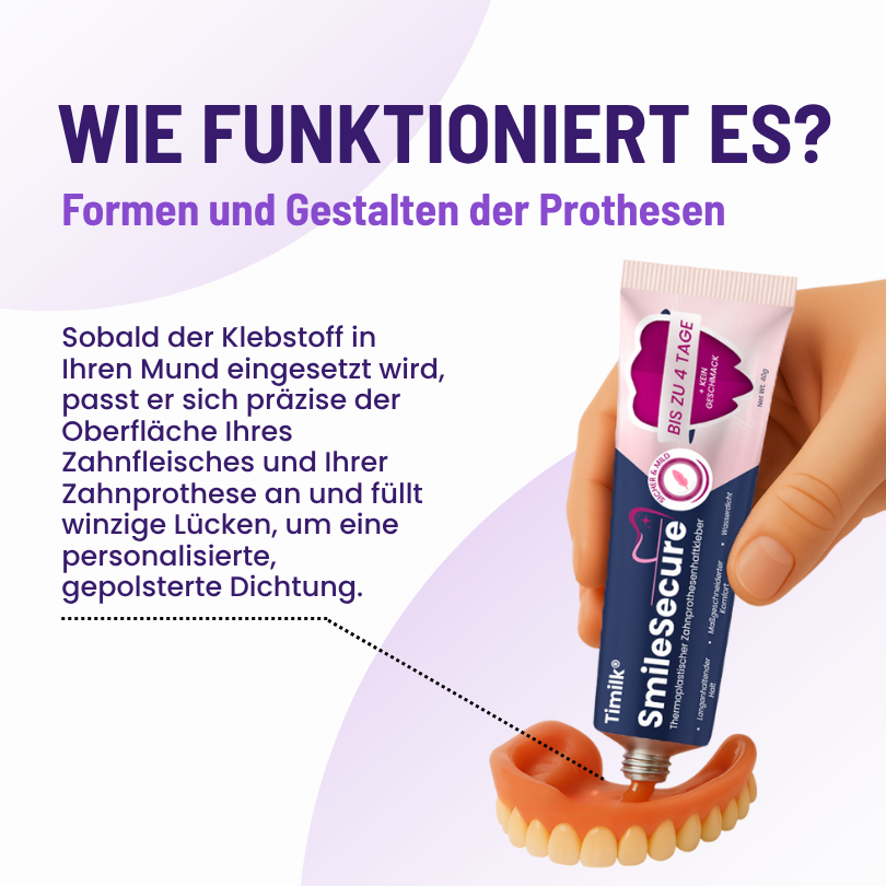 Erleben Sie unvergleichlichen Komfort und Sicherheit mit Timilk® SmileSecure Thermoplastischem Prothesenhaftmittel. Seine innovative hitzeaktivierte Formel passt sich den natürlichen Konturen Ihres Zahnfleisches an und schafft eine personalisierte Abdichtung, die Ihre Prothesen fest an Ort und Stelle hält.