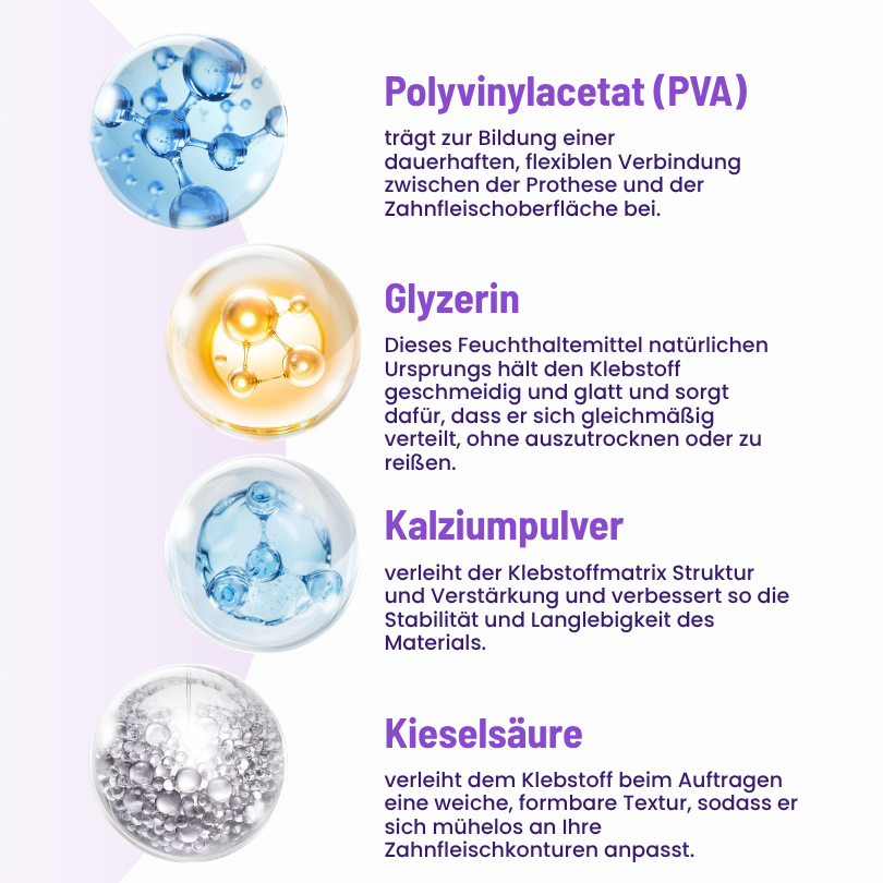 Ein wichtiges Bindemittel, bekannt für seine ausgezeichneten Hafteigenschaften. Polyvinylacetat hilft dabei, eine dauerhafte, flexible Verbindung zwischen der Prothese und der Zahnfleischoberfläche zu bilden. Seine thermoplastische Natur ermöglicht es, sich beim Erhitzen zu erweichen und dann beim Abkühlen zu verhärten — wodurch eine individuell angepasste Abdichtung entsteht, die tagelang an Ort und Stelle bleibt.